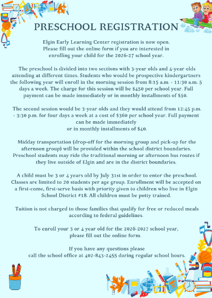 Elgin Public School Preschool & Kindergarten Registration is now open for the 2026-2027 school year!